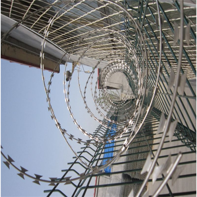 不銹鋼刀片刺網(wǎng)的用途:世界各國已將刀片剌網(wǎng)廣泛用于軍事重地、監(jiān)獄、政府機關(guān)、銀行,以及生活小區(qū)圍墻、私人住宅、別墅的圍墻、門窗、高速公路、鐵路護欄以及邊境線等用來防護保安。中國監(jiān)獄基本上用的都是刀片刺網(wǎng)