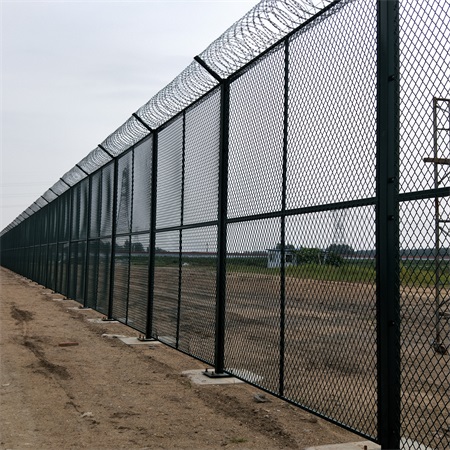 機(jī)場(chǎng)圍界網(wǎng)又稱作“Y型安全防御護(hù)網(wǎng)" ,是由V型支架立柱,加強(qiáng)型焊接片網(wǎng)安全防盜連接件和熱鍍鋅刀片刺籠組成強(qiáng)度和安全防御性很高。近年來(lái)被廣泛應(yīng)用在機(jī)場(chǎng),軍事基地等高安全場(chǎng)所。注:如果在機(jī)場(chǎng)護(hù)欄網(wǎng)頂部加裝刀片剌絲、刀片剌繩后又很好的增強(qiáng)了安全防護(hù)性能。采用電鍍、熱鍍、噴塑、浸塑等防腐形式,具有很好的抗老化、抗曬、耐候等特點(diǎn)。其產(chǎn)品造型美觀、花色多樣,既起到圍欄作用,又起到美化作用。由于具有安全性高、防攀爬能力好,網(wǎng)片連接方式采用特制SBS緊扣件,有效防止人為的破壞性拆卸,橫向四道折彎加強(qiáng)筋,使網(wǎng)面強(qiáng)度顯著增加。