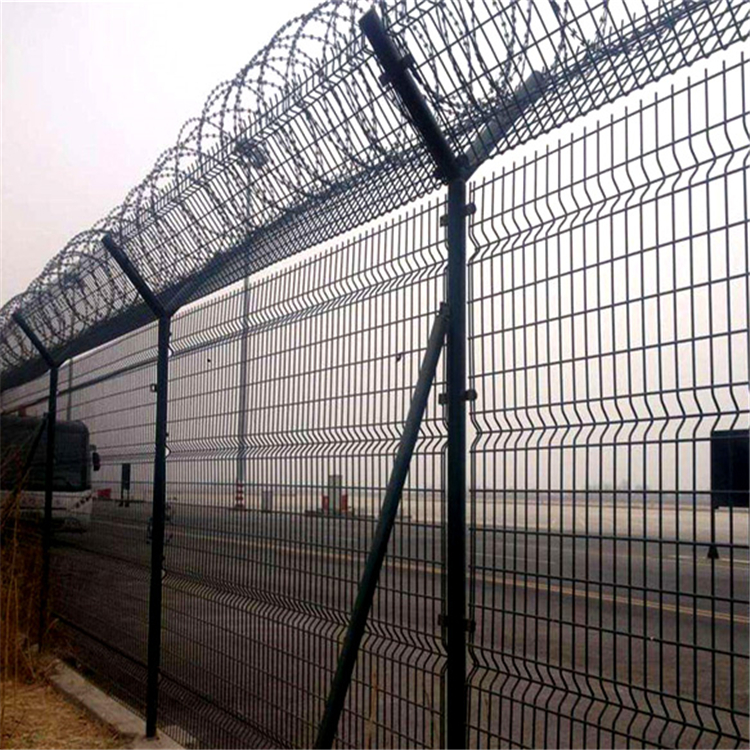 普及機(jī)場圍欄網(wǎng)的國際標(biāo)準(zhǔn):圍界網(wǎng)片及V型網(wǎng)的網(wǎng)孔其相鄰橫絲間距不得大于10cm,豎絲間距不得大于5cm,機(jī)場圍界網(wǎng)片與立柱之間的縫隙不得大于2mm,網(wǎng)片離地間距不得大于2cm。焊接圍界網(wǎng)片的鋼絲直徑必須大于等于5mm。機(jī)場圍界的立柱應(yīng)采用60*60mm方管制成,管壁厚度不得低于2mm,立柱及網(wǎng)片的表面防腐年限不能低于8年。機(jī)場圍界網(wǎng)頂部安裝的刀片刺網(wǎng)直徑要大于600mm,刺圈間距20-25cm。機(jī)場鋼筋圍界網(wǎng)的立柱基礎(chǔ)應(yīng)采用現(xiàn)澆混凝土制成,截面500*500mm,高度800mm。
